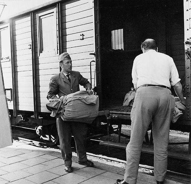 Posten lossas från tåget i Åkersberga. Lantbrevbärare Ingemar