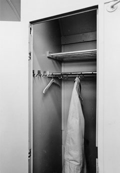 Garderob. Observera belysningskontakten ovanför översta gångjärnet.