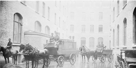 Fältpost vid postutställningen på Centralpostkontorets i Stockholm gård år 1903. Till vänster fältpostexpeditionsvagn av 1901 års modell, till höger fältposttransportvagn av samma årsmodell.