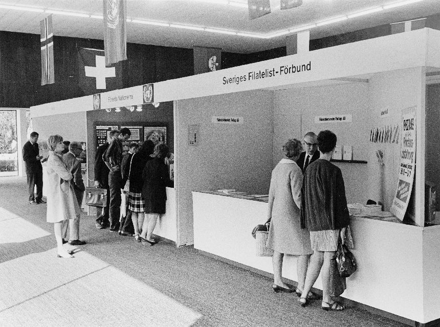 En representant från Sveriges Filatelist-Förbund, t.h., infor-merar