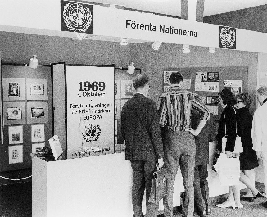 Representanten för Förenta Nationerna säljer FN:s frimärken.