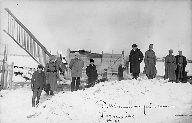 Vykort. Tullbommen på isen i Torne älv.
