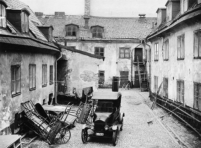 Klara Norra Kyrkogata och Bryggargatan. Fastigheten revs 1930 för att lämna plats för Postgirohuset, som blev färdigt 1932. Foto taget mot öster.