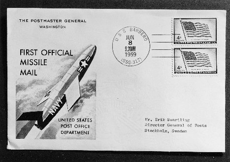 Förstadags brev befordrat med raket, stämplat USS Barbero, Jun 8