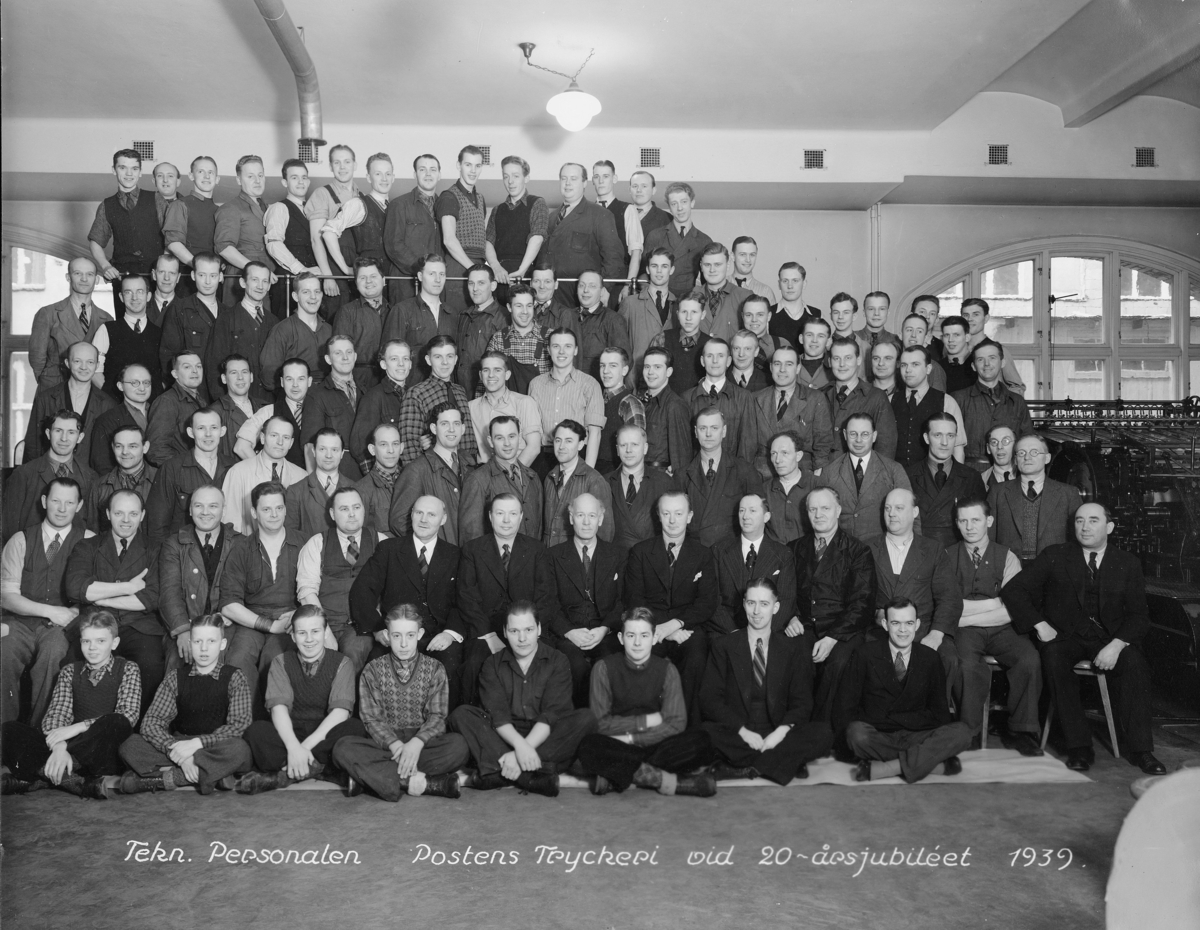 Postverkets tryckeri, Centralposthuset, Stockholm 1939. Foto med anledning av personalklubben Posttypens 20-års jubileum.