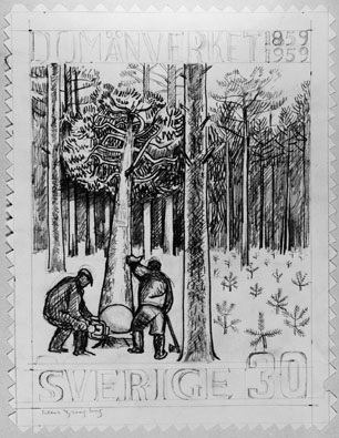 Förslagsteckningar - skisser - till frimärket Domänverket 100 år, utgivet 4/9 1959. Konstnär: Sven Ljungberg. Förslag "1" (på baksidan No I). Valör 30 öre.