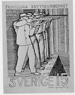 Frimärksförlaga - skissförslag - till frimärket Frivilliga Skytteväsendets 100-årsjubileum, utgivet 30/6 1960, av konstnär Sven Ljungberg. (I Postmusei samlingar). Foton 2/10 1961. Valör 15 öre.