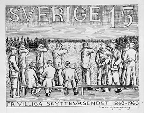 Titel: Frimärksförslag - skissförslag - till frimärket Frivilliga Skytteväsendets 100-årsjubileum, utgivet 30/6 1960, av konstnär Sven Ljungberg. (I Postmusei samlingar). Valör 15 öre.