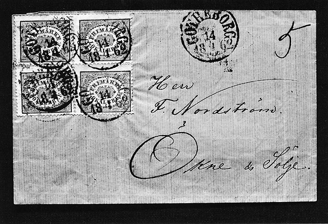 Brev - kuvert - till Ökne & Sölje frankerat med 2 par bruna Lokalmärken 1862. Avstämplat "Göteborg 14.1.1862". Karteringsnr "5". Ur Lagerlöfs donation - Band IV, blad 1298.