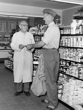 Lantbrevbärare Erik Johansson lämnar post till postombudet Birath i Åsättra affär. Den bilåkande lantbrevbäraren Erik Johansson arbetade på linjen Åkersberga-Singö-Björnhuvud-Åkersberga.