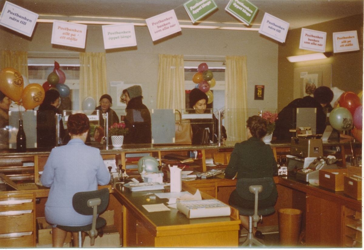 Interiör vid kassadisakrna vid Postkontoret i Lönsboda, 1969.