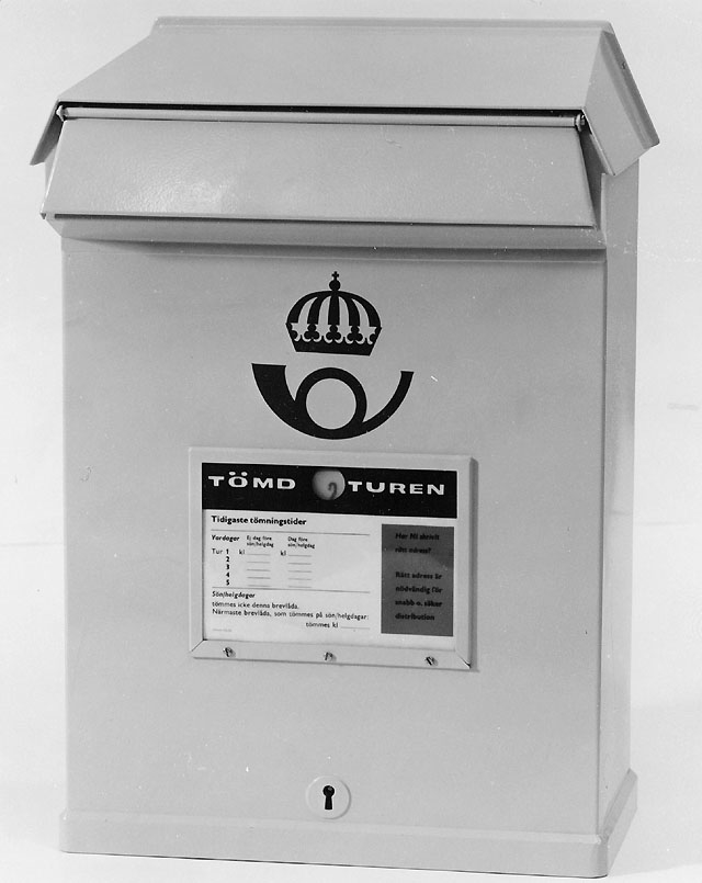 Brevlåda, gul, av plåt, för utomhusbruk. Med bottentömning och