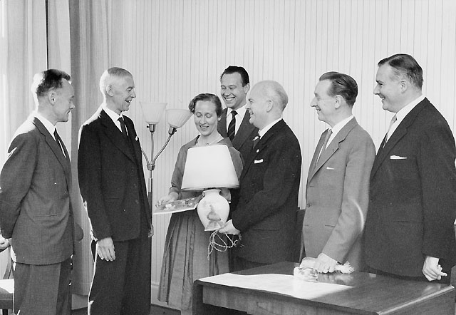 Carlgren uppvaktar med en bordslampa och en PF:s blomster-fondsadress.
