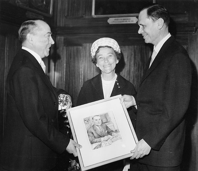 Generaldirektör Erik Swartling (t.h.)uppvaktar med ett porträtt