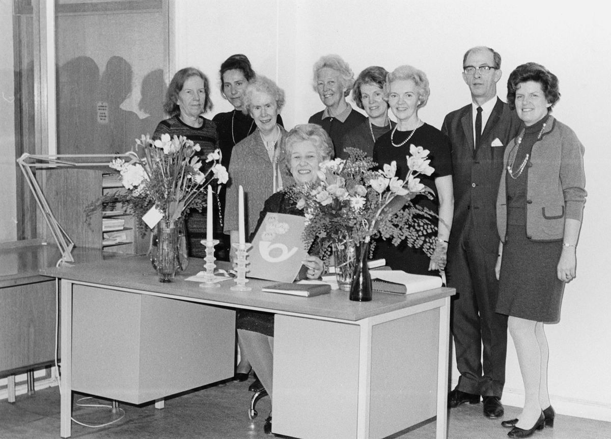 Fru Elvy Eriksson-Nowacki omgiven av en del av PFA:s personal.
