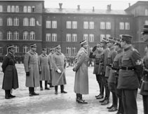 Från folkomröstningen i Saar, januari 1935. En svensk trupp deltog i övervakningen och ett svenskt fältpostkontor inrättades i Saar. Kronprins Gustaf Adolf samtalar med officerare vid inspektionen av den svenska truppen, vid Svea Livgarde, Linnégatan, Stockholm. Närmast t.h. är fältpostmästare Sven Svenmark (med postemblemet).