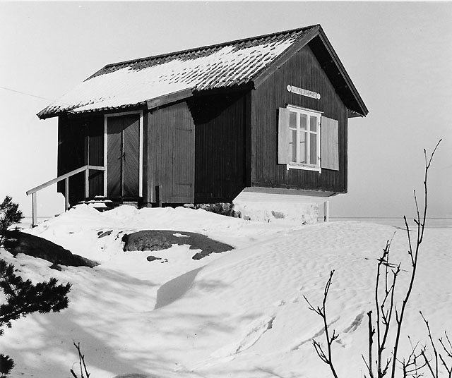 Exteriör av ateljén med trappan till förstugan i förgrunden och