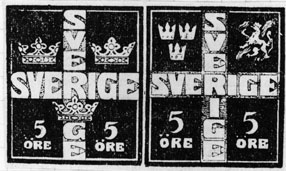Tävlingsförslag till nya frimärken (svenska). Tävling arrangerad av Svenska Dagbladet 1934. Två sammanhängande förslag med varianter av Tre Kronor. Valör 5 öre.