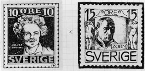 Tävlingsförslag till nya frimärken (svenska). Tävling arrangerad av Svenska Dagbladet 1934. Två förslag visande August Strindberg, valör 10 öre till vänster. och Anders Zorn, valör 15 öre till höger.