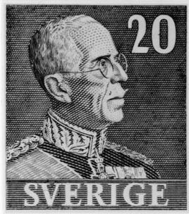 Frimärksförlaga till frimärket Gustaf V, utgivet 1939. Foton 1940-talet. Ny porträtt-typ med Gustaf V:s bild. Originalteckningen av Torsten Schonberg. Valör 20 öre.