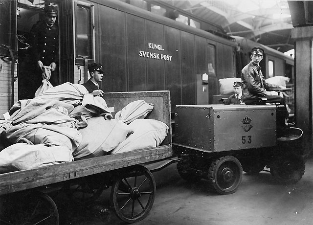 på Malmö järnvägsstation f.v.b. med truck till postkontoret Malmö 1.