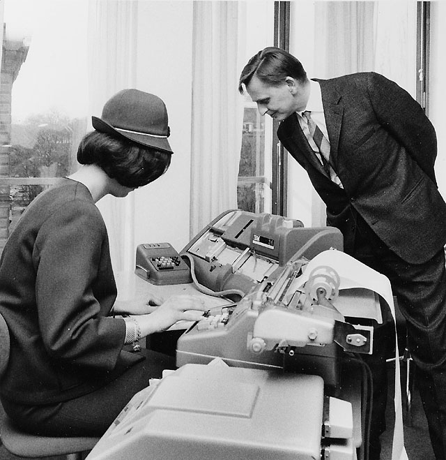 hålkortsstansningen fungerar. Post- värdinnan arbetar med IBM 24.