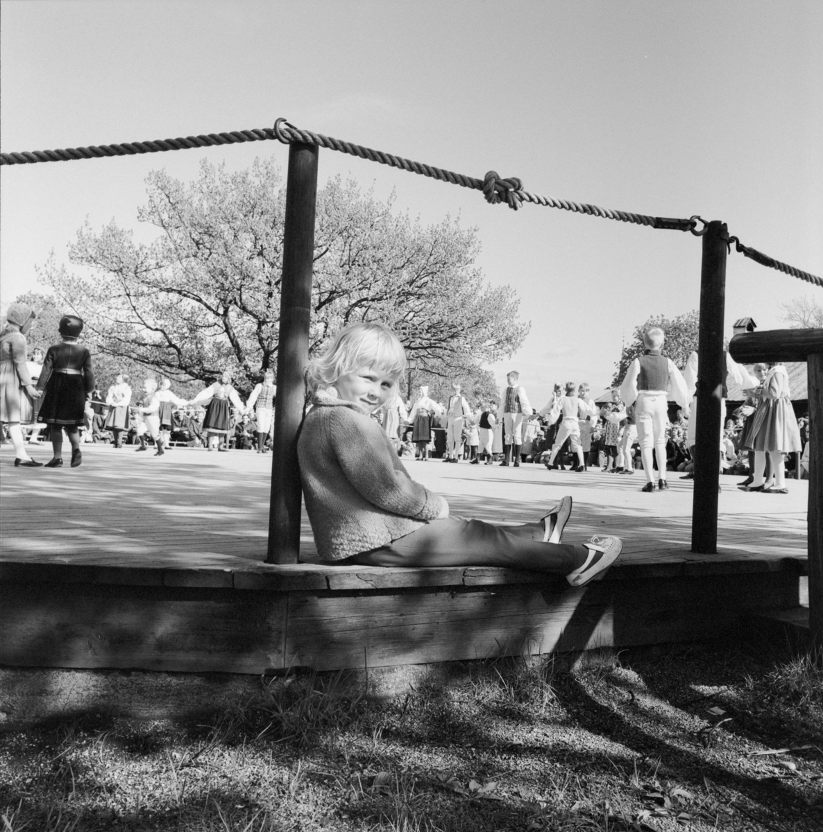 Dansuppvisning på scenen vid Bollnästorget, Skansen. Litet barn sitter på scenkanten.