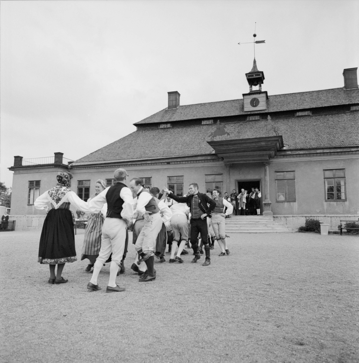 Folkdansuppvisning på gårdsplanen utanför Skogaholms herrgård, Skansen.