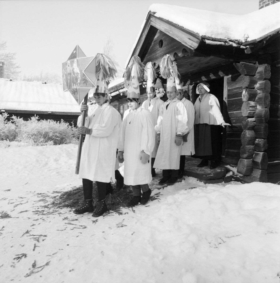 Vinterbilder på gårdar, ute och inne. Stjärngossar vid Moragården, Skansen.