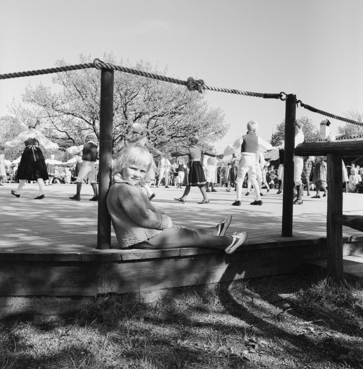 Dansuppvisning på scenen vid Bollnästorget, Skansen. Litet barn sitter vid sidan om.