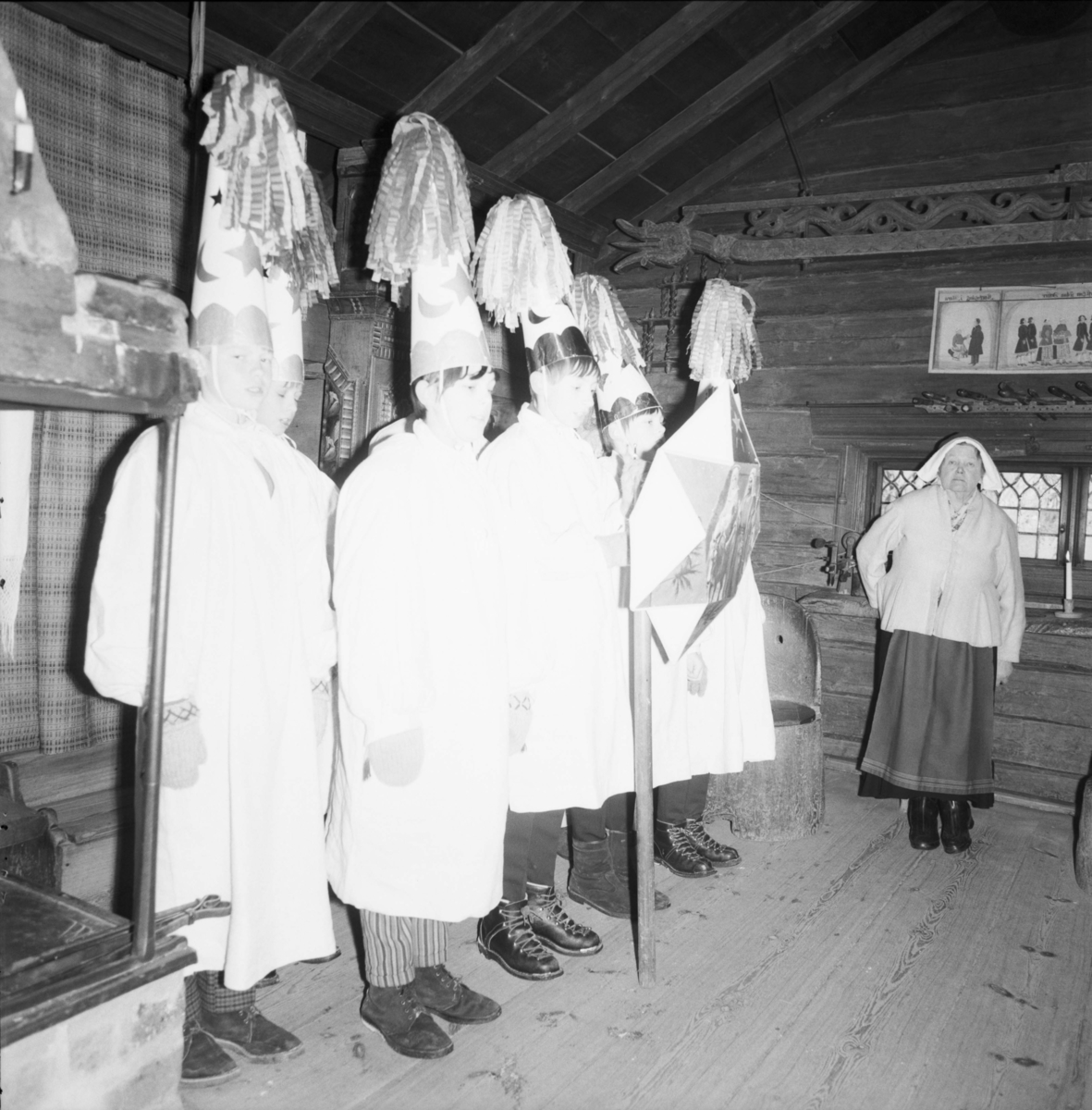 Vinterbilder på gårdar, ute och inne. Stjärngossar i Morastugan, Skansen.