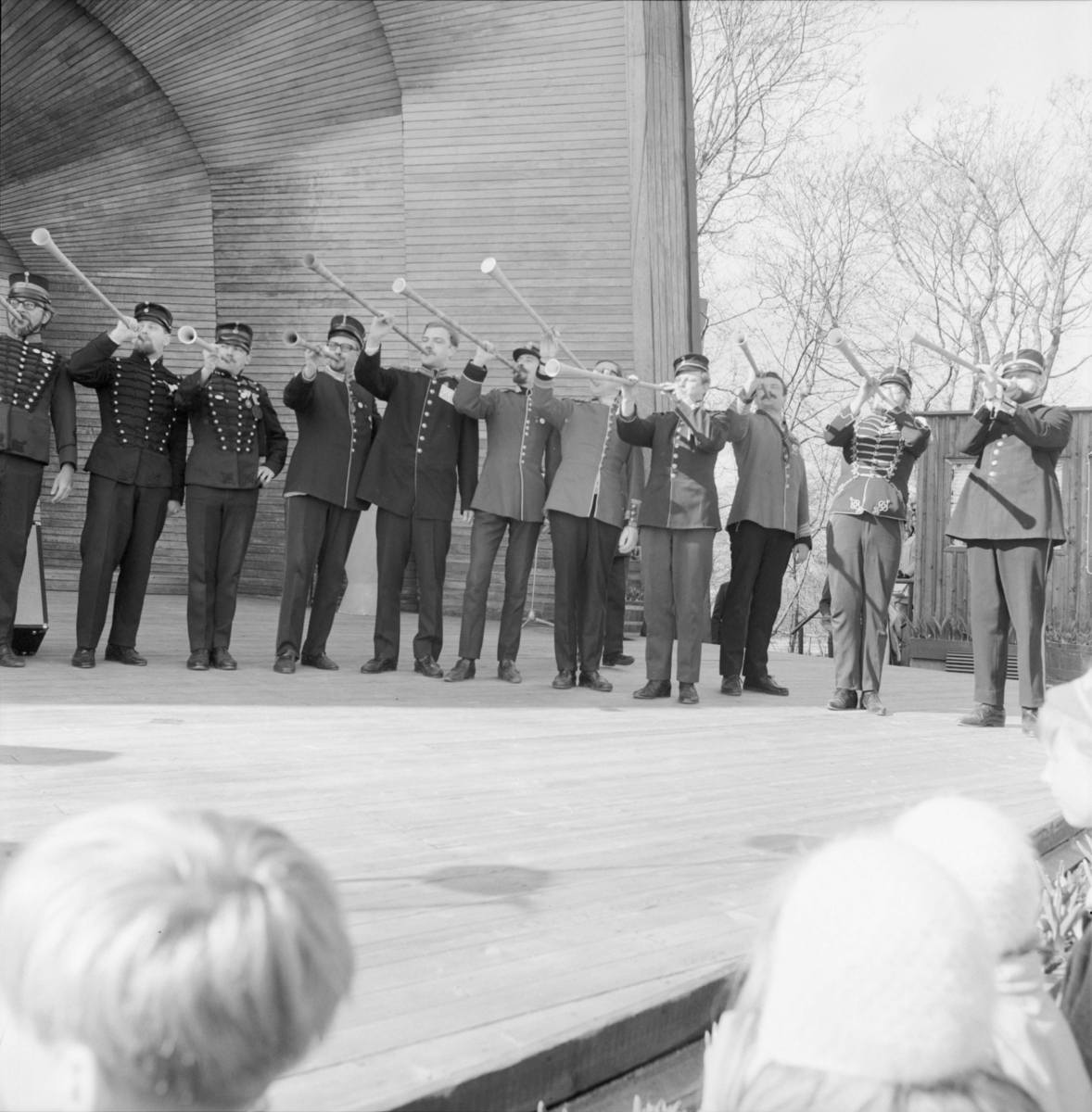 Uniformsklädda män blåser i näverlurar på Sollidenscenen. Fröken Skansen.