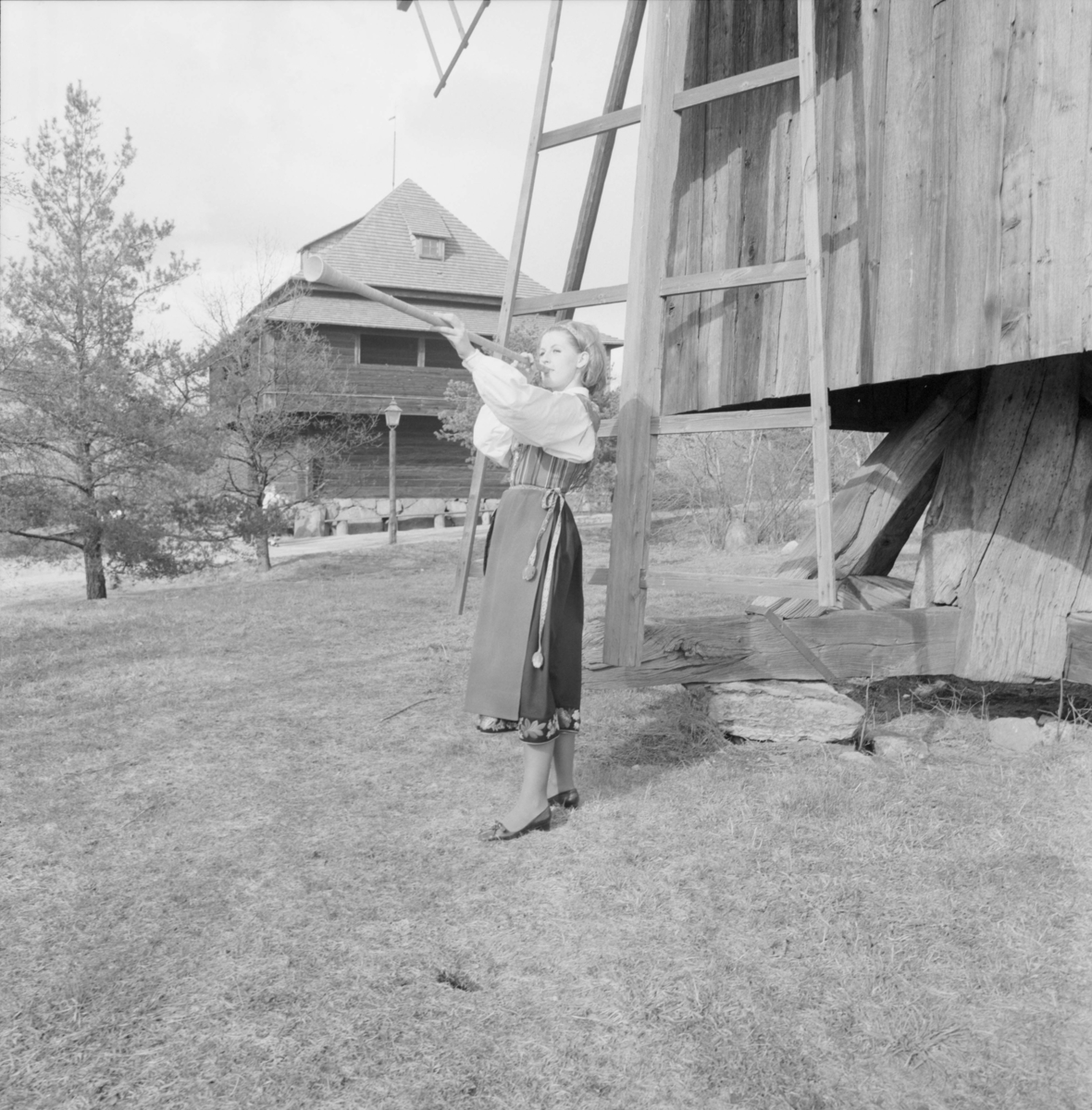 Kvinna blåser i näverlur. Fröken Skansen