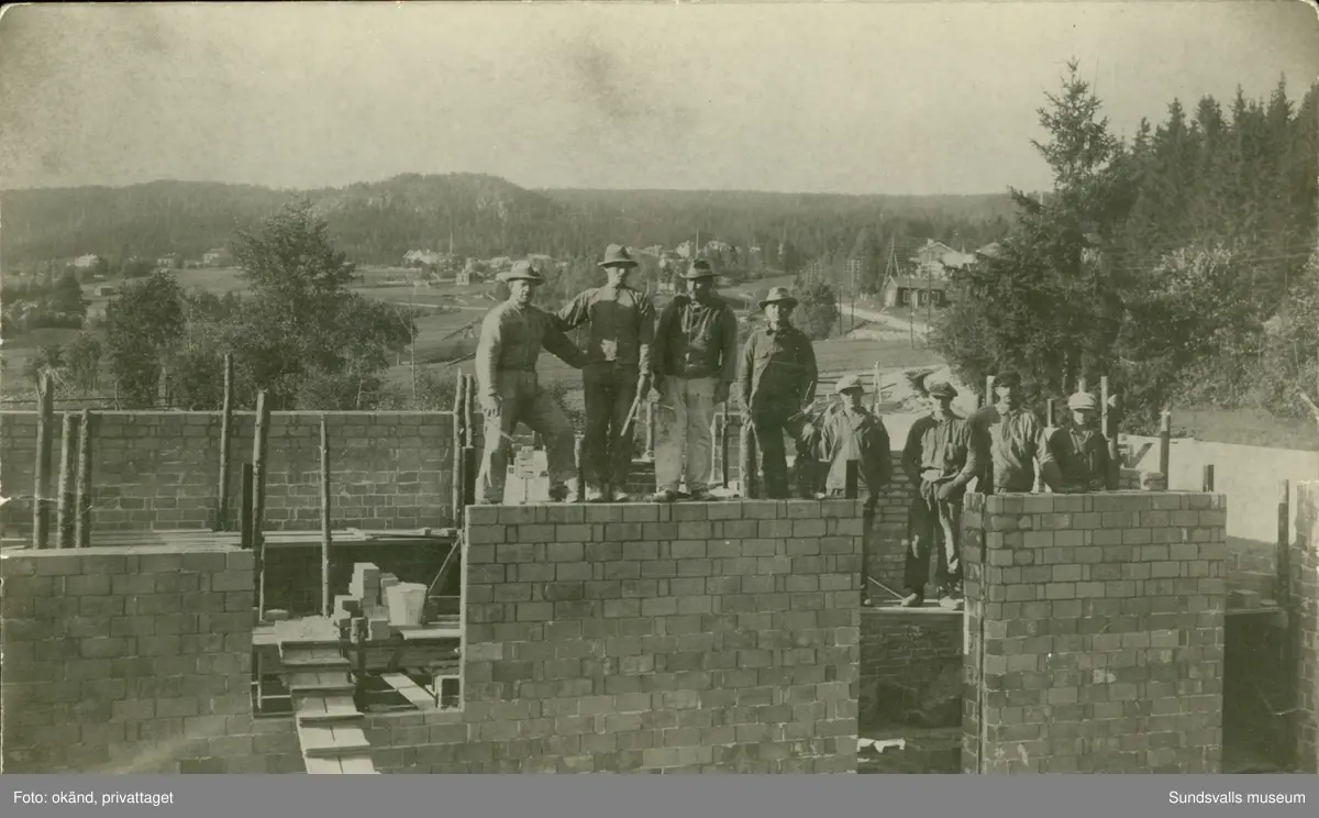 Vykort med motiv över ett husbygge, enligt handskriven text byggnation av Hallsta skola i Indal.