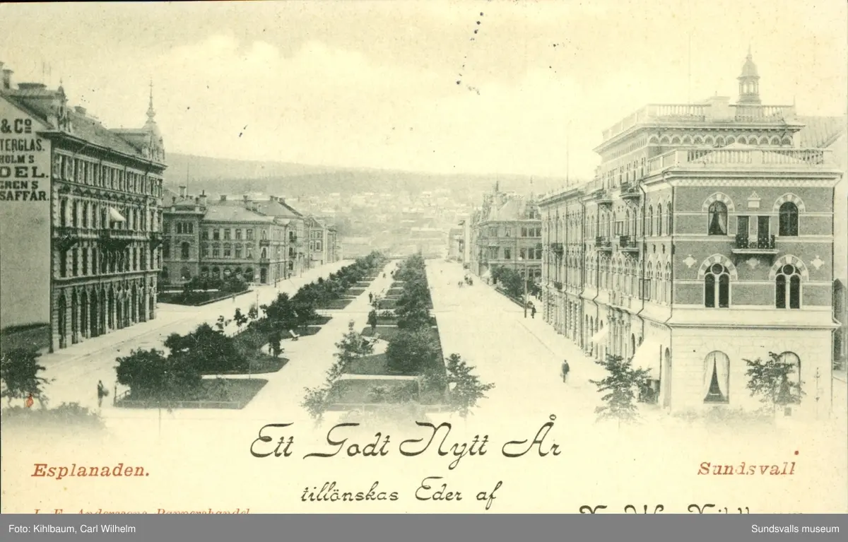 Vykort med motiv över Esplanaden i Sundsvall och texten Ett Gott Nytt År tillönskas er av.