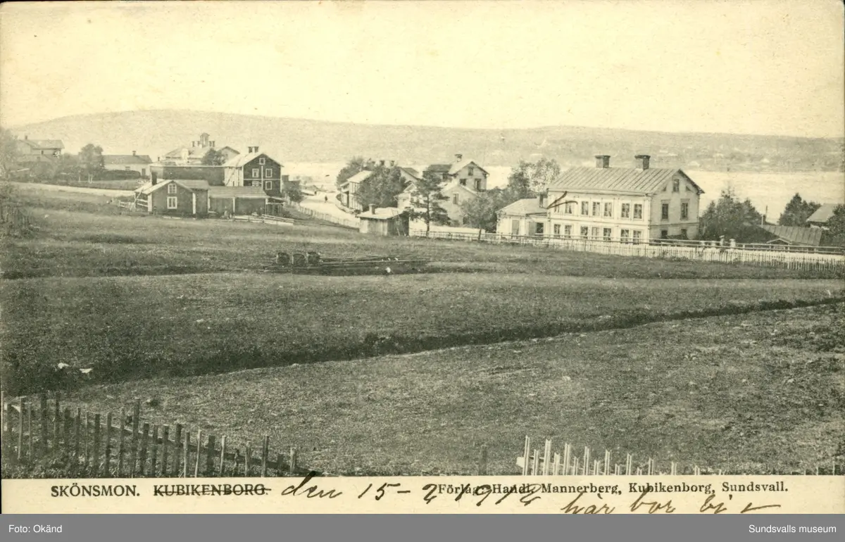 Vykort med motiv över Skönsmon och Kubikenborg i Sundsvall.