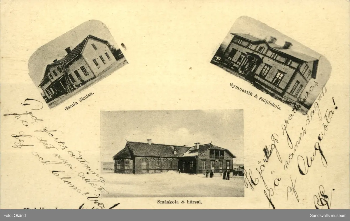 Vykort med motiv över gamla skolan, gymnastik- och slöjdskolan, småskolan och hörsalen på Kubikenborg i Sundsvall.