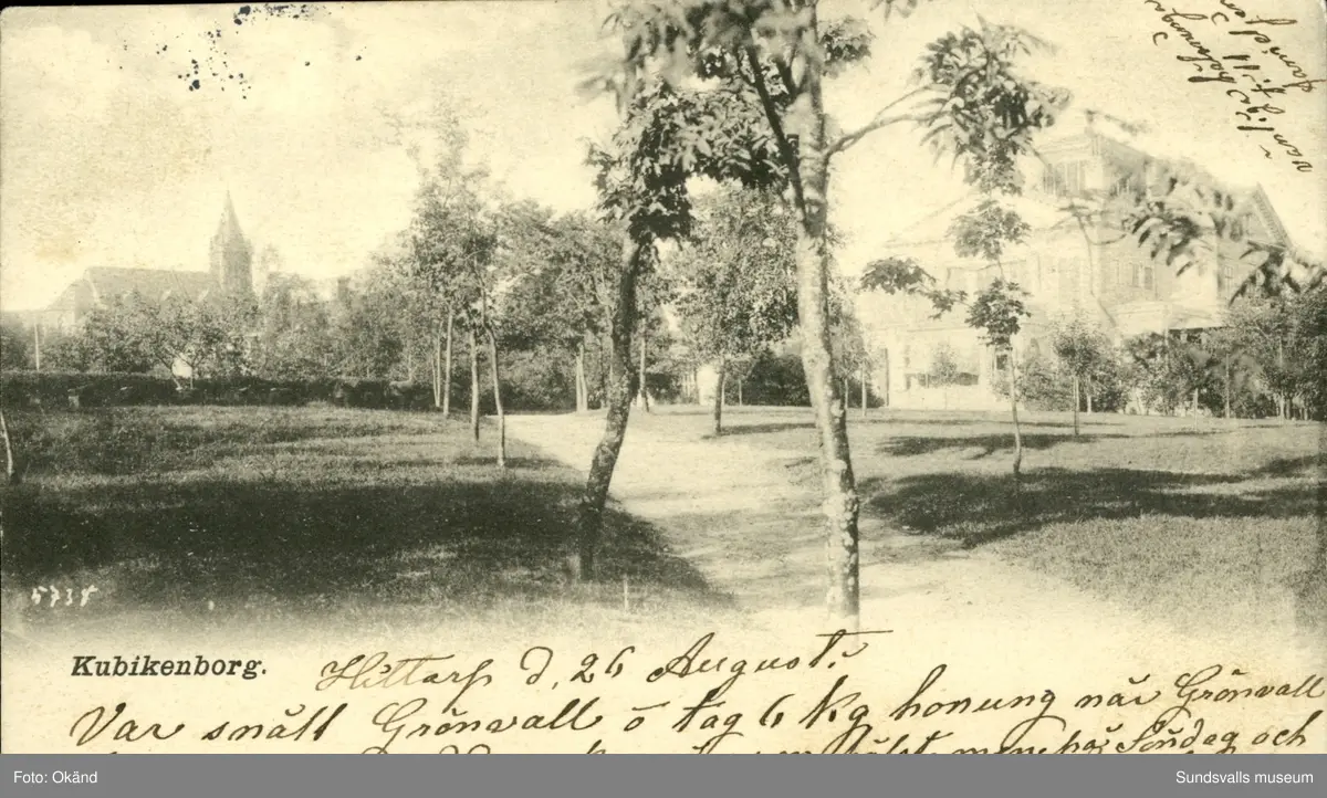 Vykort med motiv över Kubikenborgs herrgård och kyrka i Sundsvall.