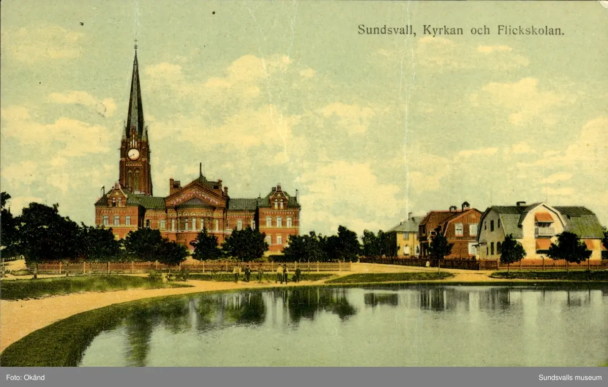 Vykort med motiv över Flickskolan och Gustav Adolfs kyrka.