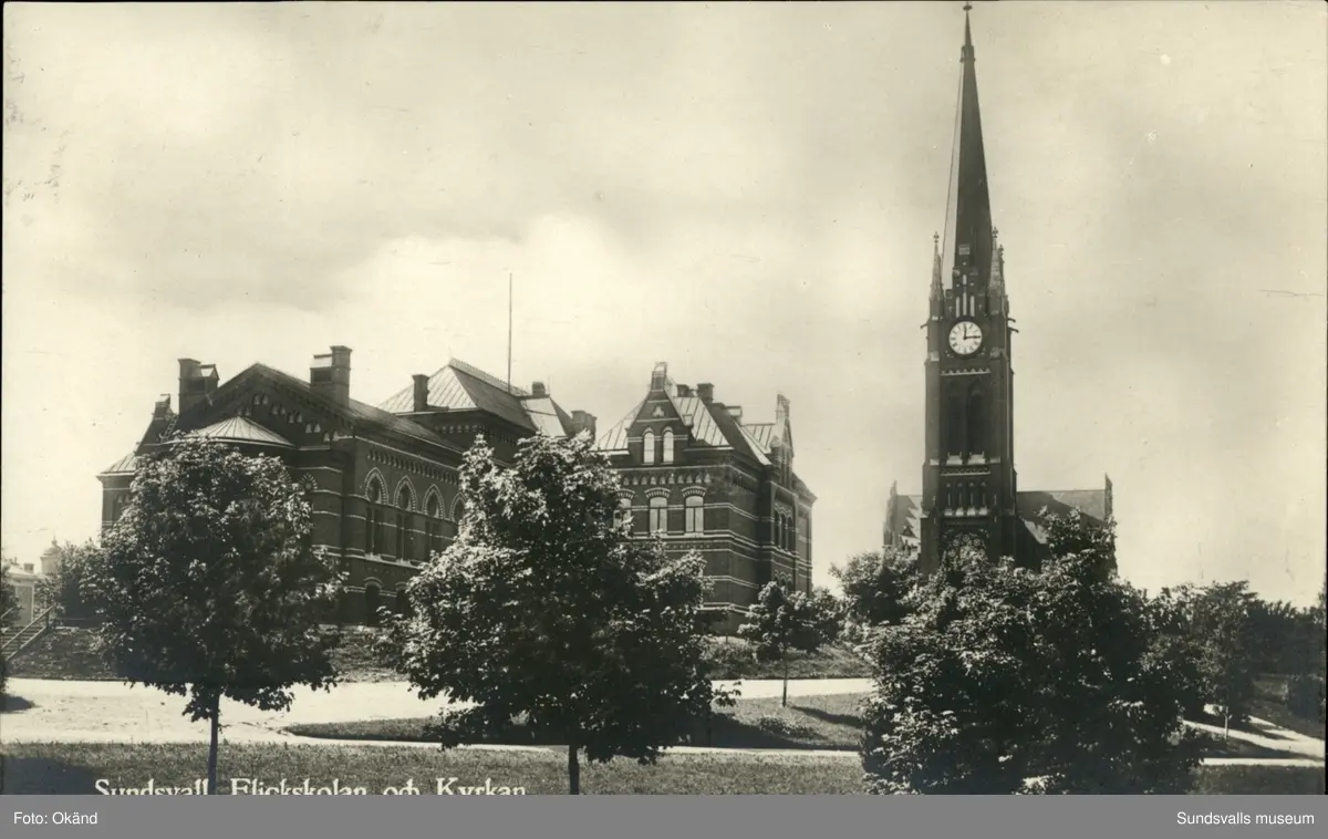 Vykort med motiv över Flickskolan och Gustav Adolfs kyrka.
