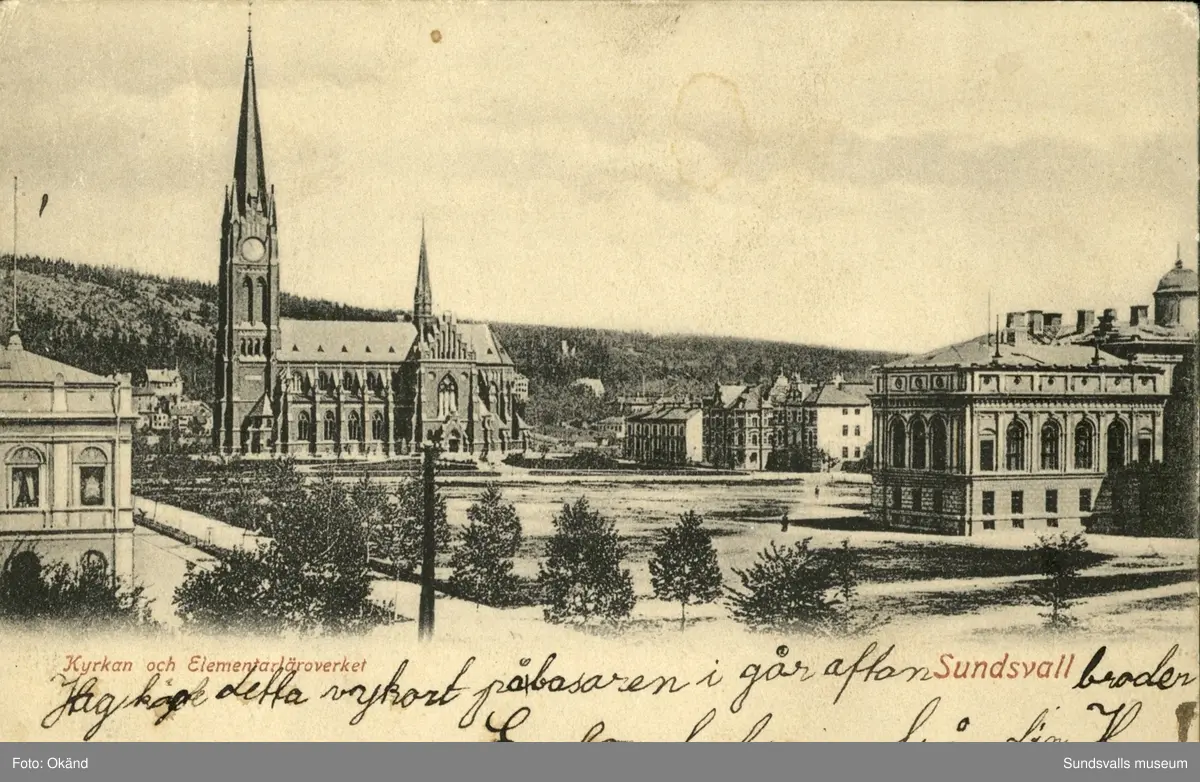 Vykort med motiv över Gustav Adolfs kyrka och Elementärläroverket.