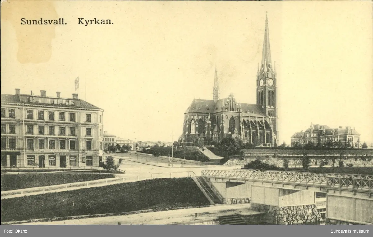 Vykort med motiv över Gustav Adolfs kyrka och Storbron.