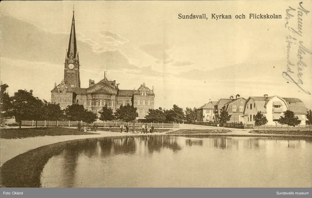 Vykort med motiv över Gustav Adolfs kyrka och Flickskolan.