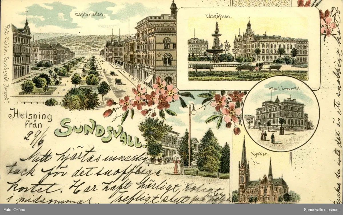 Vykort över Vängåvan, Allmänna läroverket, Esplanaden och Gustav Adolfs kyrka i Sundsvall.