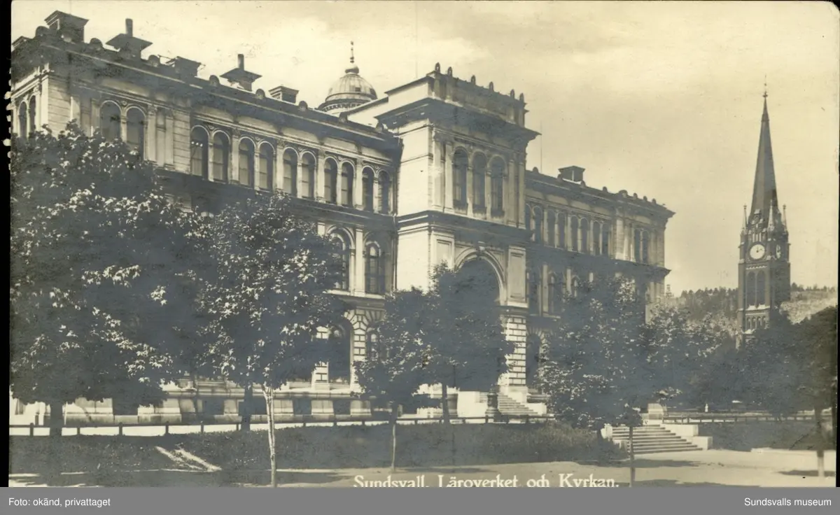 Vykort med motiv av Allmänna läroverket och Gustav Adolfskyrka i Sundsvall.