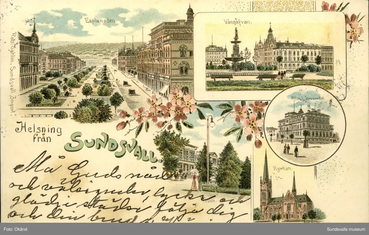 Vykort med ritat motiv över Sundsvall med infällda bilder av Vängåvan, Gustav Adolfskyrka, Allmänna läroverket, Esplanden och Tivoli.