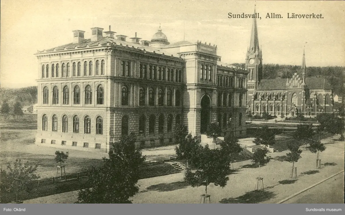 Vykort med motiv över allmänna läroverket och Gustav Adolfs kyrka i Sundsvall.