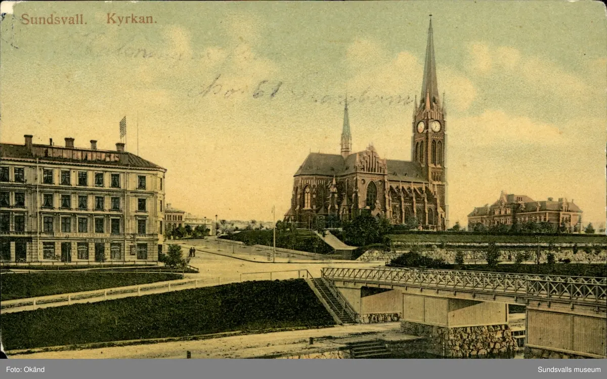 Vykort med motiv över Gustav Adolfs kyrka i Sundsvall.
