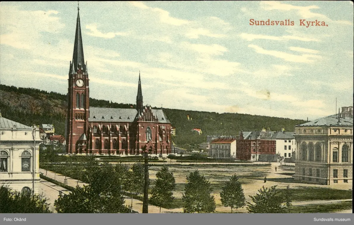 Vykort med motiv över Gustav Adolfs kyrka i Sundsvall.