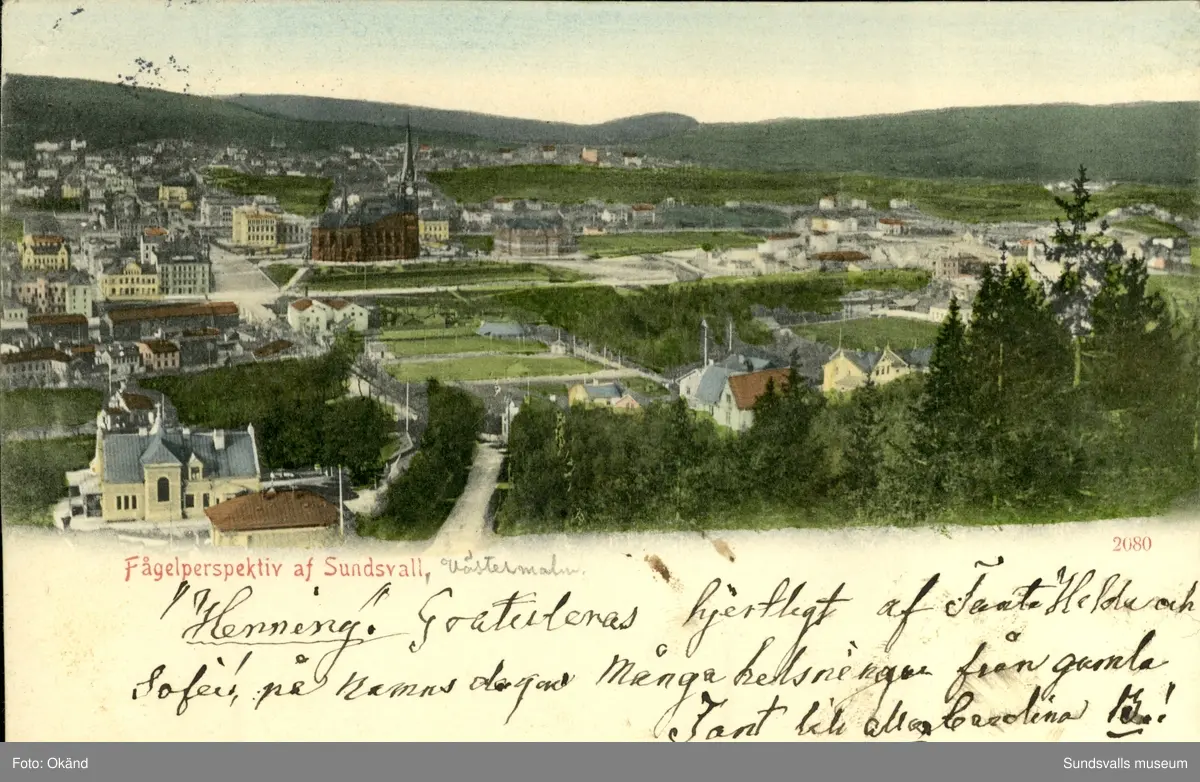 Vykort med motiv över Sundsvall och Gustav Adolfs kyrka sett från Norra berget.